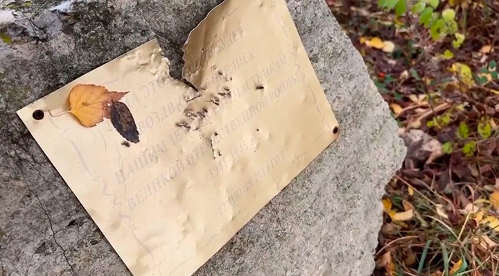 Обелиск с разбитой мемориальной табличкой в честь земляков — участников Великой Отечественной войны. Скриншот: видео на ТГ-канале Царьград