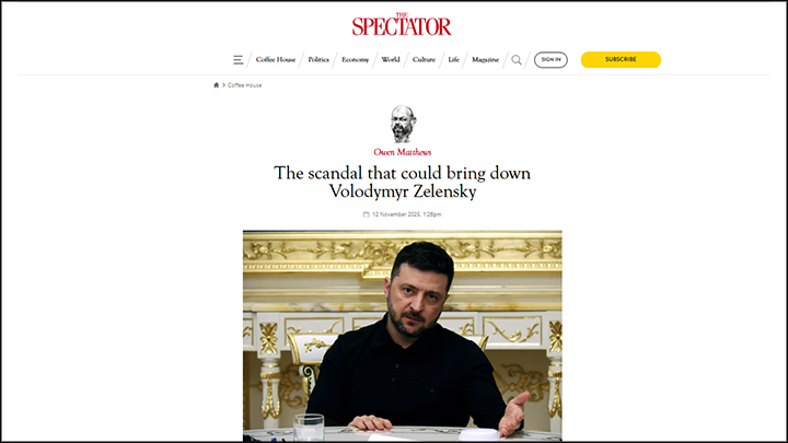 Коррупционный скандал, разыгравшийся в Киеве, может привести к отставке Зеленского, сообщает The Spectator. Скриншот страницы сайта издания