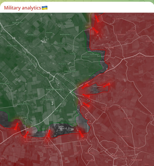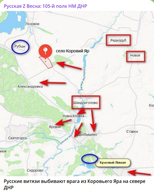 По информации бойцов 105-го полка НМ ДНР, идёт активное наращивание нашей группировки для штурма Константиновки. Наши также выбивают врага из Коровьего Яра — ВСУ отходят к Рубцам и соседнему Лозовому на берегу Оскола, где у них создан мощный укрепрайон.