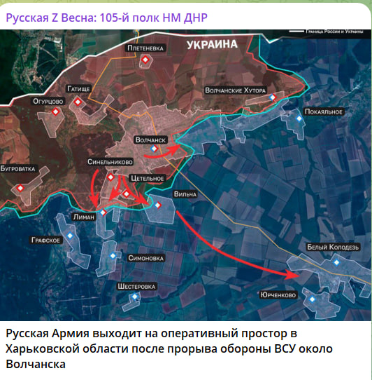 Основные укрепления ВСУ проходят по линии населёнников: Синельникова, Вильчи и Лимана. Наши зашли в Лиман. Выяснилось, что противник так и не подготовил нормальную оборону за почти два года боевых действий в Волчанске. Бои идут в центре посёлка.