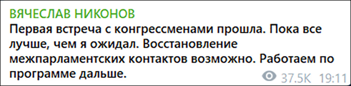 Сам депутат, который ранее не раз показывал себя человеком, умеющим отстаивать правду, не уходя в важных вопросах в компромисс, считает этот визит и возобновление межпарламентских переговоров "прорывом блокады России, демонстрацией решимости окружения Трампа, проявлением смены баланса во внутренней политике США".
