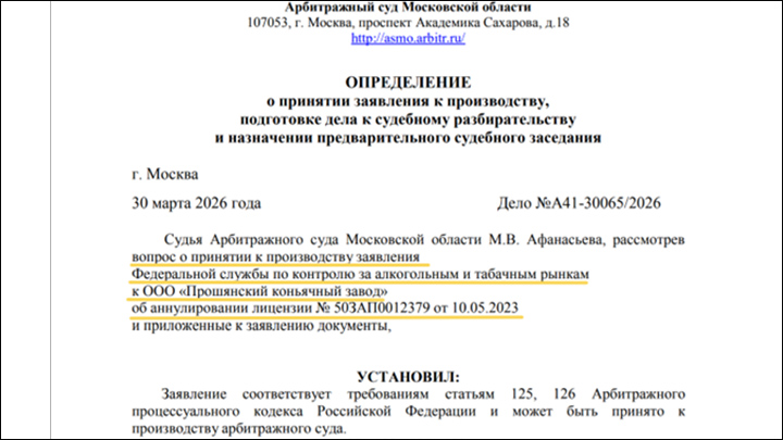 Московский арбитраж принял в производство заявление Росалкогольрегулирования к Прошянскому заводу//Скриншот страницы решения суда