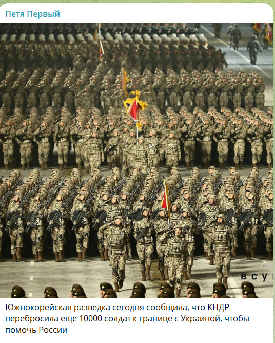 И это все новости? Отнюдь! Разведка Южной Кореи вновь заявляет об отправке ВС КНДР в Курскую область. Сообщается о передислокации 10 000 "львов Кима". И, судя по реакции военкоров, в этот раз, вероятно, это не вброс: