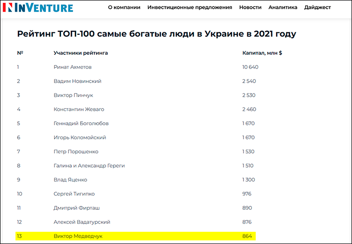 Список ста богатейших людей Украины за 2021 год. Виктор Медведчук со своими энергетическими активами занимает почётное 13-е место. Скриншот страницы сайта inventure.com.ua