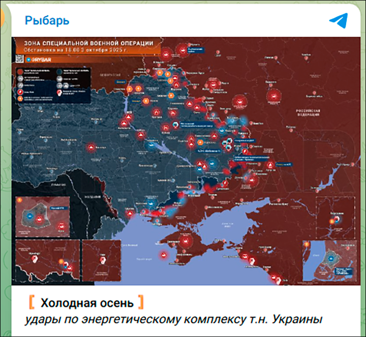 Здесь скриншот страницы телеграм-канала "Рыбарь" с картой ударов по украинским энергетическим объектам. Источник: https://t.me/rybar/74129