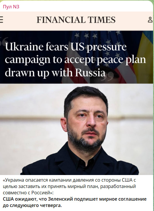 "Заокеанские оптимисты давят на Зеленского", - подытожил украинский блогер "ЗеРада". Причём в США уверены, что Зеленский действительно пойдёт на подписание 27 ноября. По крайней мере, так это преподносится FT: