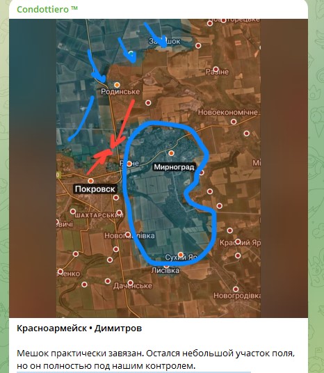 Остался небольшой участок поля, но он полностью под нашим контролем. Выдачи из Покровска и Мирнограда почти нет. Единицы просачиваются по ночам, если повезёт и дронщики не увидят. Или туман и дожди. Остальные остаются внутри. Их участь ясна и понятна. Талантливые украинские генералы снова показали свою эффективность,