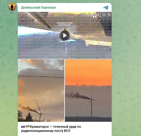Ранее, 22 октября, осуществлено точечное поражение одного из промышленных ветрогенераторов типа WTU-4500, расположенного на северо-западной окраине Краматорска. Что же это объясняет? Как пишет паблик "Донбасский Партизан":