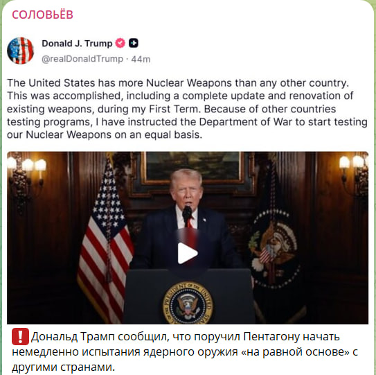 Министр обороны Андрей Белоусов предложил Верховному главнокомандующему немедленно начать подготовку к испытаниям. Идею поддержал и начальник Генштаба генерал Герасимов. Владимир Путин отдал распоряжение МИД, Минобороны, спецслужбам и гражданским ведомствам изучить и проанализировать вопрос о возможном начале испытаний США ядерного оружия и подготовке доклада по ответным мерам.