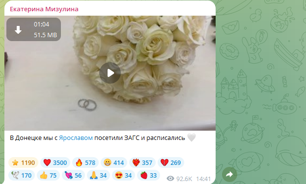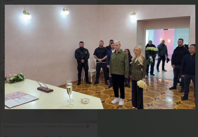 Бракосочетание пары оказалось большим сюрпризом для их поклонников. Ранее оба сообщали, что отправились в Донецкую Народную Республику, чтобы поздравить жителей региона с Днём народного единства. О том, что Донецк был выбран городом, где будет скреплён их союз, влюблённые молчали как партизаны.