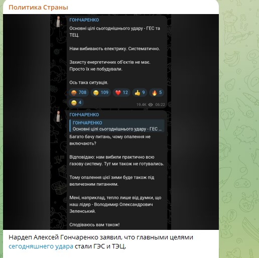 Во время последней массированной атаки этим утром в Верховной раде только и успели "пикнуть" - газа почти нет, поэтому вопросы об отоплении этой зимой стремительно теряют актуальность. Нет отопления - нет вопросов. Украинский нардеп-террорист Алексей Гончаренко* признался, что его попросту закидывают вопросами об отоплении, но теперь-то есть ответ на них. По его словам, Украине систематически выбивают электрику, а "защиты энергетических объектов нет. Её просто не построили". Гончаренко* также отметил, что из-за повреждений газовой инфраструктуры под вопросом остаётся и отопительный сезон.