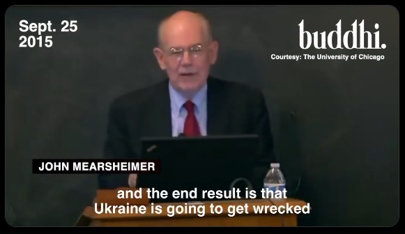 Он поместил фрагмент выступления Миршаймера в Чикагском университете - оно состоялось 25 сентября 2015 года. Уже тогда политолог чётко видел, куда всё идёт и к каким последствиям может привести, если всё продолжится в том же духе.