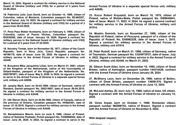 29 лиц, с номерами паспортов, все данные есть. И паспорта, и подтверждение, что у них подписан контракт с ВСУ. И где они служат - это мы знаем тоже. Один был из Германии. Большинство - это Польша. Колумбия, США, Великобритания. Есть финны. Очень разный букет. Семь-восемь стран точно,