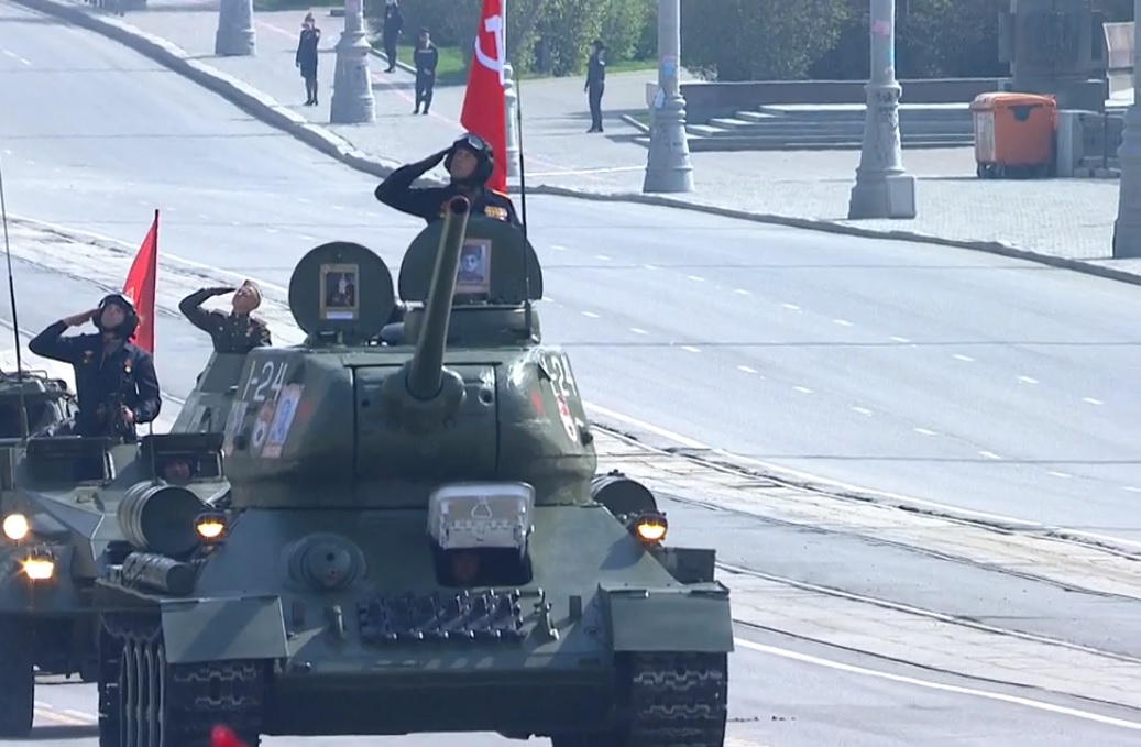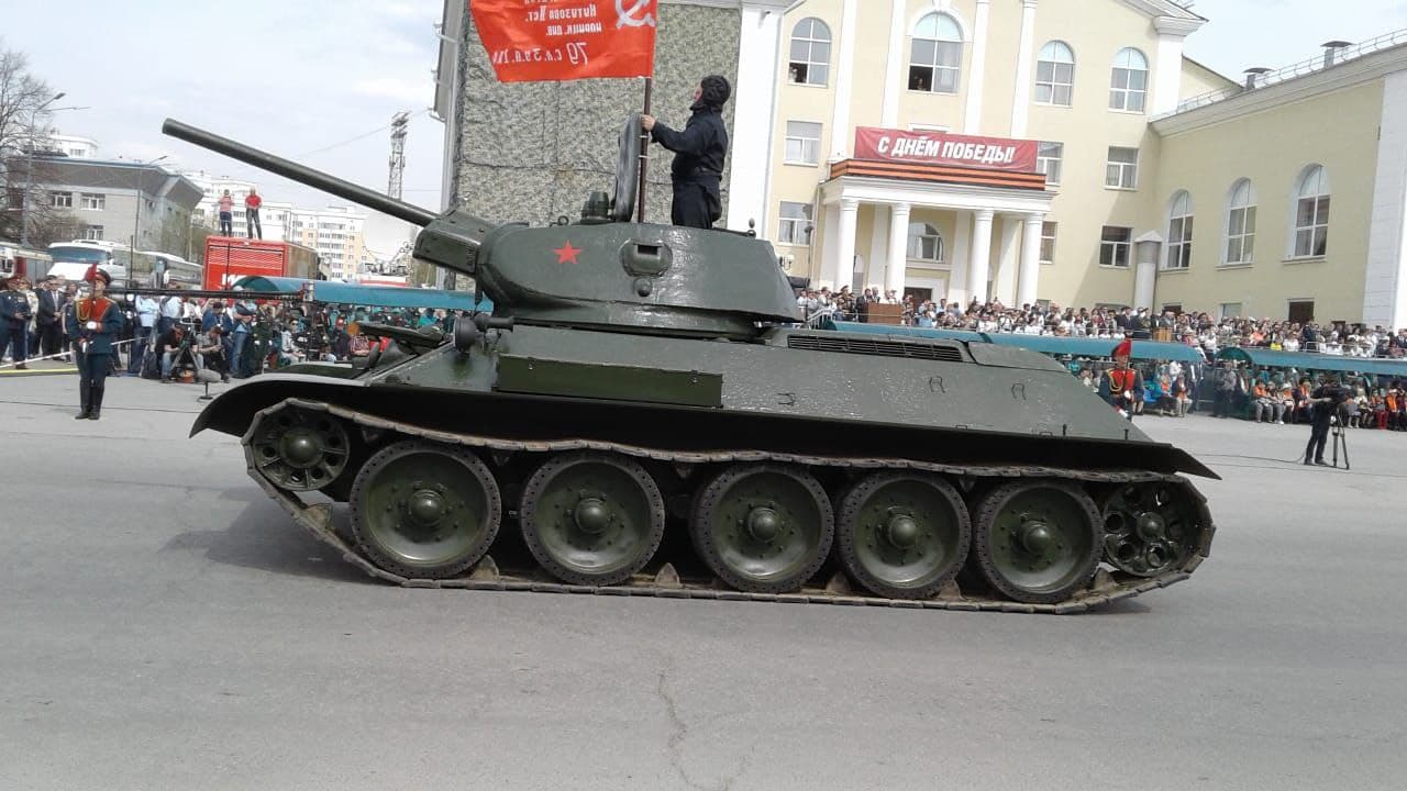 10:42. Колонну военной техники возглавляет танк Т-34.